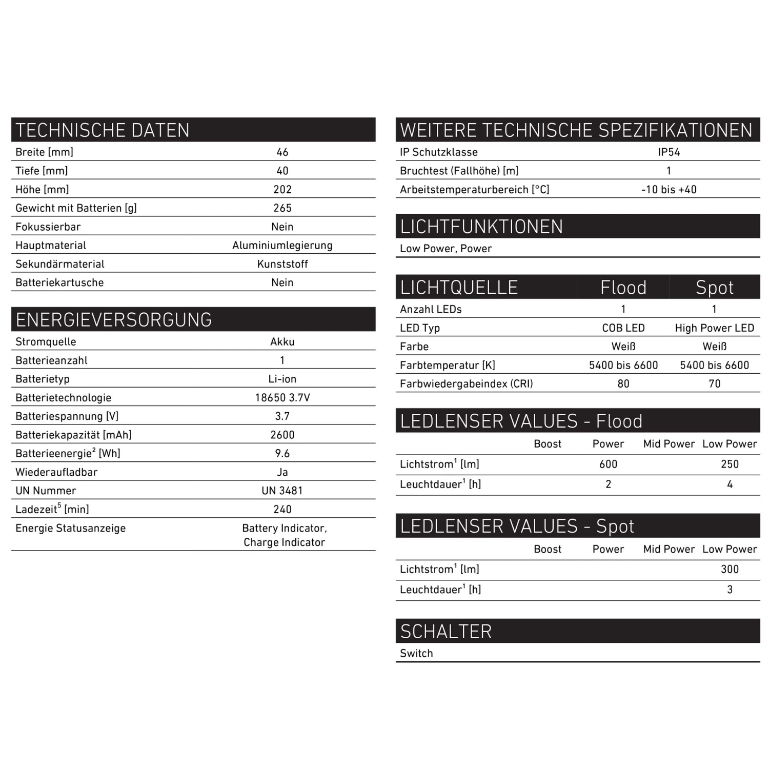 Produkteigenschaften:Spot on! Mit der kompakten iW7R haben Sie Ihr Arbeitslicht immer griffbereitUnd damit kommt helle Freude auf: Dafür sorgen die hohe Strahlkraft von bis zu 600 Lumen, der flexible Kippmechanismus für optimale Ausleuchtung sowie das edle Premium-GehäuseKein Kabelsalat: Aufgeladen wird die iW7R in nur vier Stunden1 ganz komfortabel in der mitgelieferten Ladeschale oder der optional erhältlichen 5-Stationen-Kombi-LadevorrichtungBesonders edel und robust dank metallummanteltem KunststoffgehäuseDrei Licht-Optionen, inklusive fokussiertem Spot-Licht mit Reflektorlinse im Lampenkopf Bis zu 600 Lumen LichtleistungAufladen in Ladestation – für leichtes Handling ohne KabelsalatKippmechanismus ermöglicht flexibles Ausrichten für optimale Ausleuchtung des ArbeitsbereichsTechnische Daten:Breite [mm] 46Tiefe [mm] 40Höhe [mm] 202Gewicht mit Batterien [g] 265Fokussierbar NeinHauptmaterial AluminiumlegierungSekundärmaterial KunststoffBatteriekartusche NeinENERGIEVERSORGUNGStromquelle AkkuBatterieanzahl 1Batterietyp Li-ionBatterietechnologie 18650 3.7VWiederaufladbar JaLadezeit5 [min] 240Energie Statusanzeige Battery Indicator,Charge IndicatorIP Schutzklasse IP54Bruchtest (Fallhöhe) [m] 1Arbeitstemperaturbereich [°C] -10 bis +40LICHTFUNKTIONENLow Power, PowerPower,Low PowerLichtstrom¹ [lm] 600, 250Leuchtdauer¹ [h] 2, 4LEDLENSER VALUES – SpotLow Powermax. Lichtstrom¹ [lm] 300max. Leuchtdauer¹ [h] 3SCHALTER SwitchLieferumfang:1x LEDLENSER Akku-Arbeitsleuchte iW7R (502005)1x Ladestation1x USB Kabel1x USB Netzteil