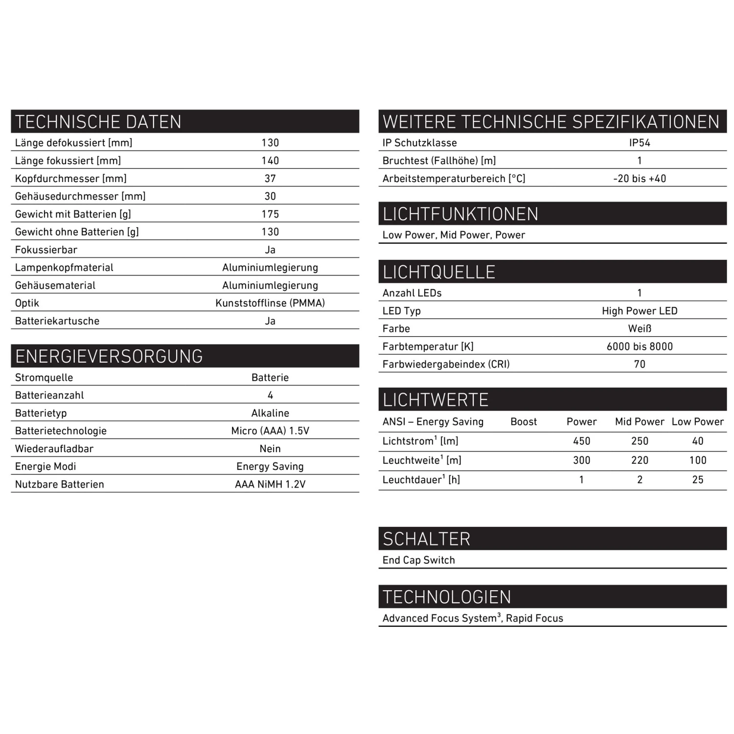 Produkteigenschaften: Vielen Dank für Dein Feedback. Denn bei der P7 haben wir viele Deiner Vorschläge bezüglich des vorherigen Modells in die Tat umgesetzt Ein größerer, griffigerer Schalter erleichtert die Bedienung mit Handschuhen Die Linse wurde neu berechnet und mit neuster LED-Technik ausgestattet Und auch ergonomisch haben wir uns an Deinen Wünschen orientiert Das macht die Lampe zu einem Allrounder mit unverwüstlicher Technik und extremer Langlebigkeit. Herausragende Ledlenser Lichtqualität – Helligkeit, Leuchtweite und Leuchtdauer sind ideal auf die Energiequelle abgestimmt Von homogenem, kreisrundem Nahlicht (defokussiert) zu scharf gebündeltem Fernlicht (fokussiert) – das patentierte3 Advanced Focus System mit Reflektorlinse ermöglicht effizientes, maßgeschneidertes Licht Großer Anwendungsbereich – umfangreiches Zubehör Nachhaltigkeit durch den modularen Aufbau – z.B. leichter Austausch der Battery Cartridge Für ein langes Lampenleben – robustes Metallgehäuse und hochwertige Goldkontakte Technische Daten: Länge defokussiert [mm] 130 Länge fokussiert [mm] 140 Kopfdurchmesser [mm] 37 Gehäusedurchmesser [mm] 30 Gewicht mit Batterien [g] 175 Gewicht ohne Batterien [g] 130 Fokussierbar Ja Lampenkopfmaterial Aluminiumlegierung Gehäusematerial Aluminiumlegierung Optik Kunststofflinse (PMMA) Batteriekartusche Ja Stromquelle Batterie Batterieanzahl 4 Batterietyp Alkaline Batterietechnologie Micro (AAA) 1.5V Wiederaufladbar Nein Energie Modi Energy Saving Nutzbare Batterien AAA NiMH 1.2V IP Schutzklasse IP54 Bruchtest (Fallhöhe) [m] 1 Arbeitstemperaturbereich [°C] -20 bis +40 Anzahl LEDs 1LED-Konfiguration:1 x LEDFarbwiedergabeindex: 70 CRIFarbtemperatur: 6,000 K – 8,000 K Power Mid Power Low PowerLeuchtkraft1 (lm) 450 250 40Leuchtweite1 (m) 300 220 100Leuchtdauer1 (h) 1 2 25Lieferumfang: 1x LEDLENSER Taschenlampe P7 3,7V (501046) 1x 2 Batteriesätze 1x Gürteltasche 1x Handschlaufe 1x Gift Box